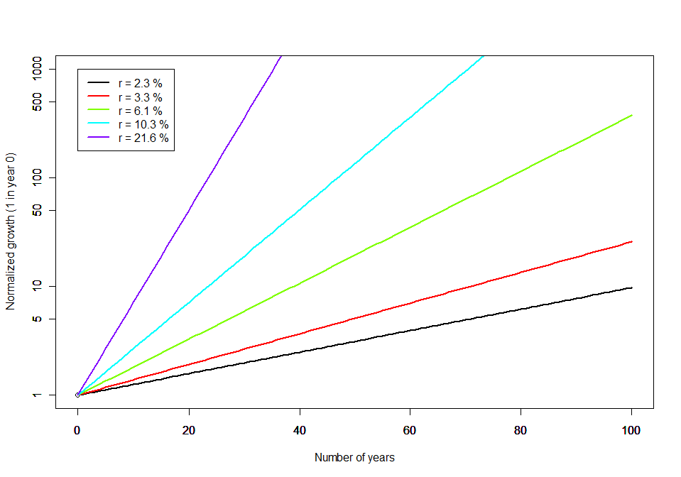 Fig. 16 Illustration of maximum technology growth starting at a level of 1 in year t=0 for a set of soft diffusion constraints with effective growth rates r as shown in the legend.