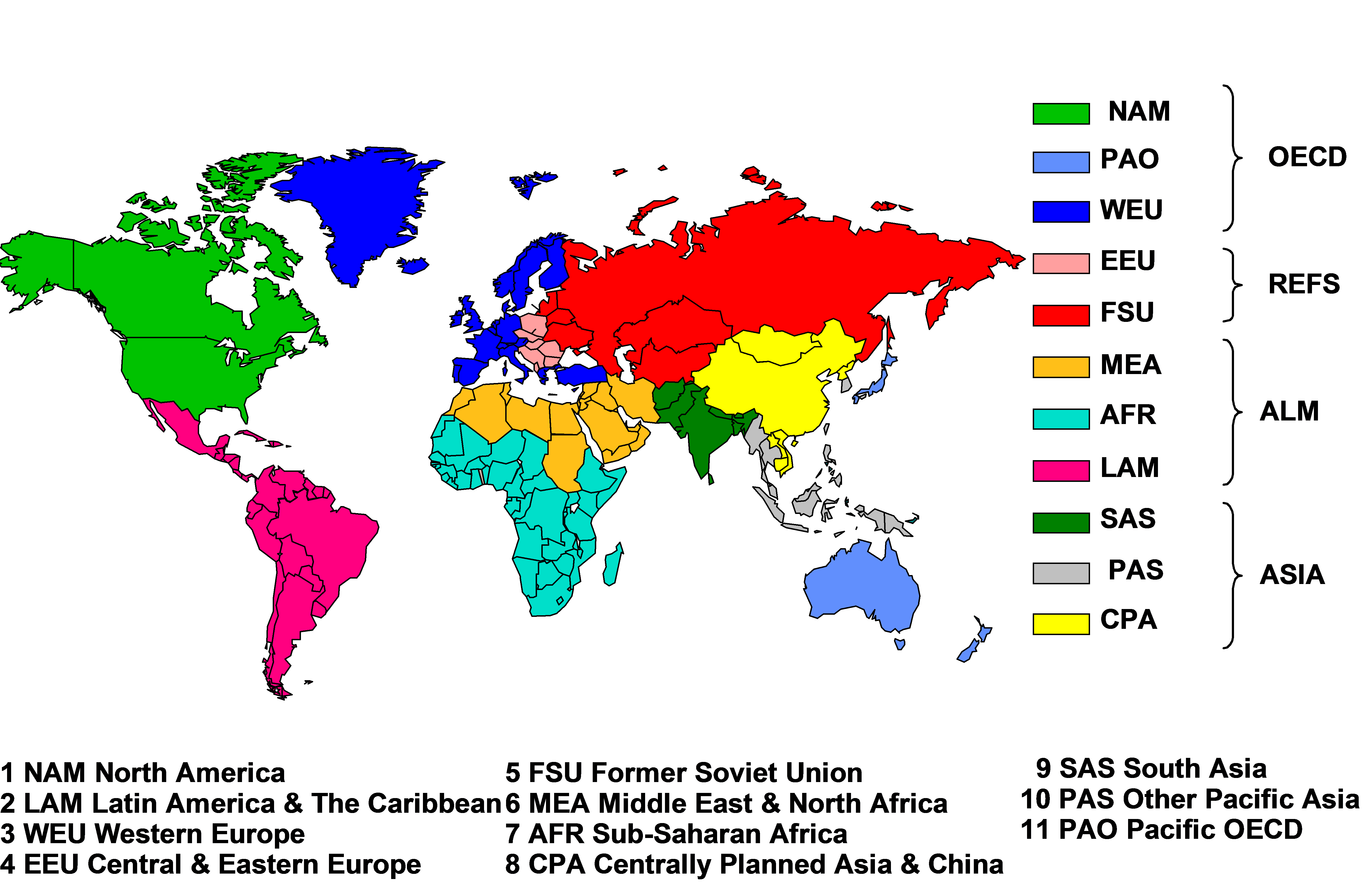 The country definitions of the 11 MESSAGEix regions are described in the table below (Table 1). In some scenarios, the MESSAGEix region of FSU (Former Soviet Union) is disaggregated into four sub-regions resulting in a 14-region MESSAGEix model.